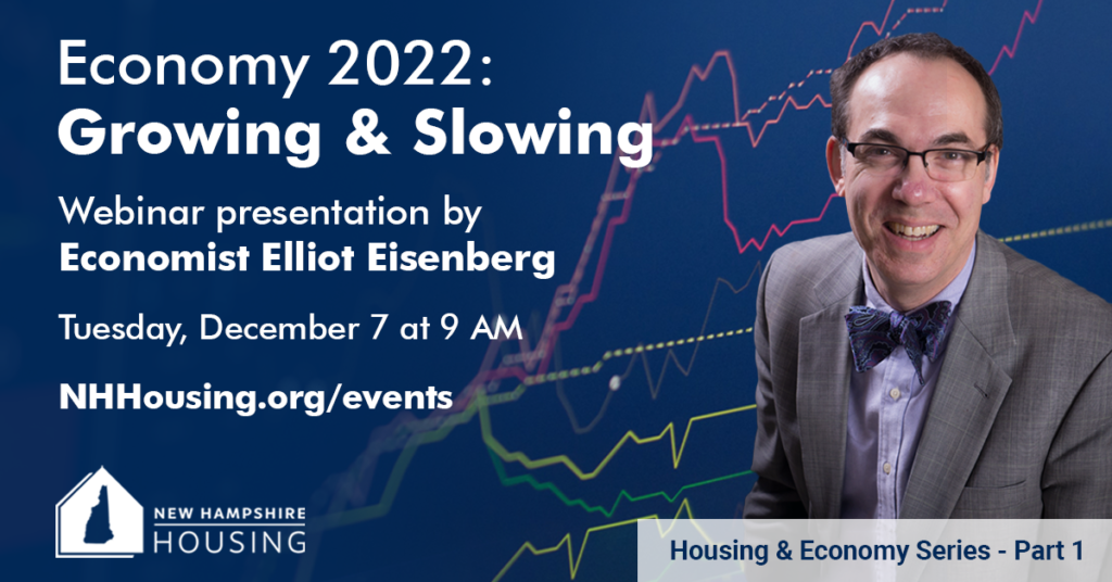 Is the economy growing or slowing, or both? And how will that impact an already tight and tumultuous state housing market? Nationally known economist Elliot Eisenberg, a dynamic and engaging speaker, will present Economy 2022: Growing & Slowing on Tuesday, December 7 at 9 AM. During this webinar presented by New Hampshire Housing, Eisenberg will look at housing trends and affordability, and how low interest rates, demographics, stimulus checks, changes in the labor market, and the supply chain have impacted state and national housing markets.