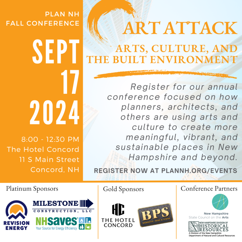 Join Plan NH on September 17 for their fall conference, Art Attack: Arts, Culture, and the Built Environment as they explore how planners, architects, and others are using arts and culture to create more meaningful, vibrant, and sustainable places in New Hampshire and beyond. Hear from outstanding speakers including keynote speaker, Dr. Annis Sengupta of the Metropolitan Area Planning Council and the Arts & Culture Division of the American Planning Association.
