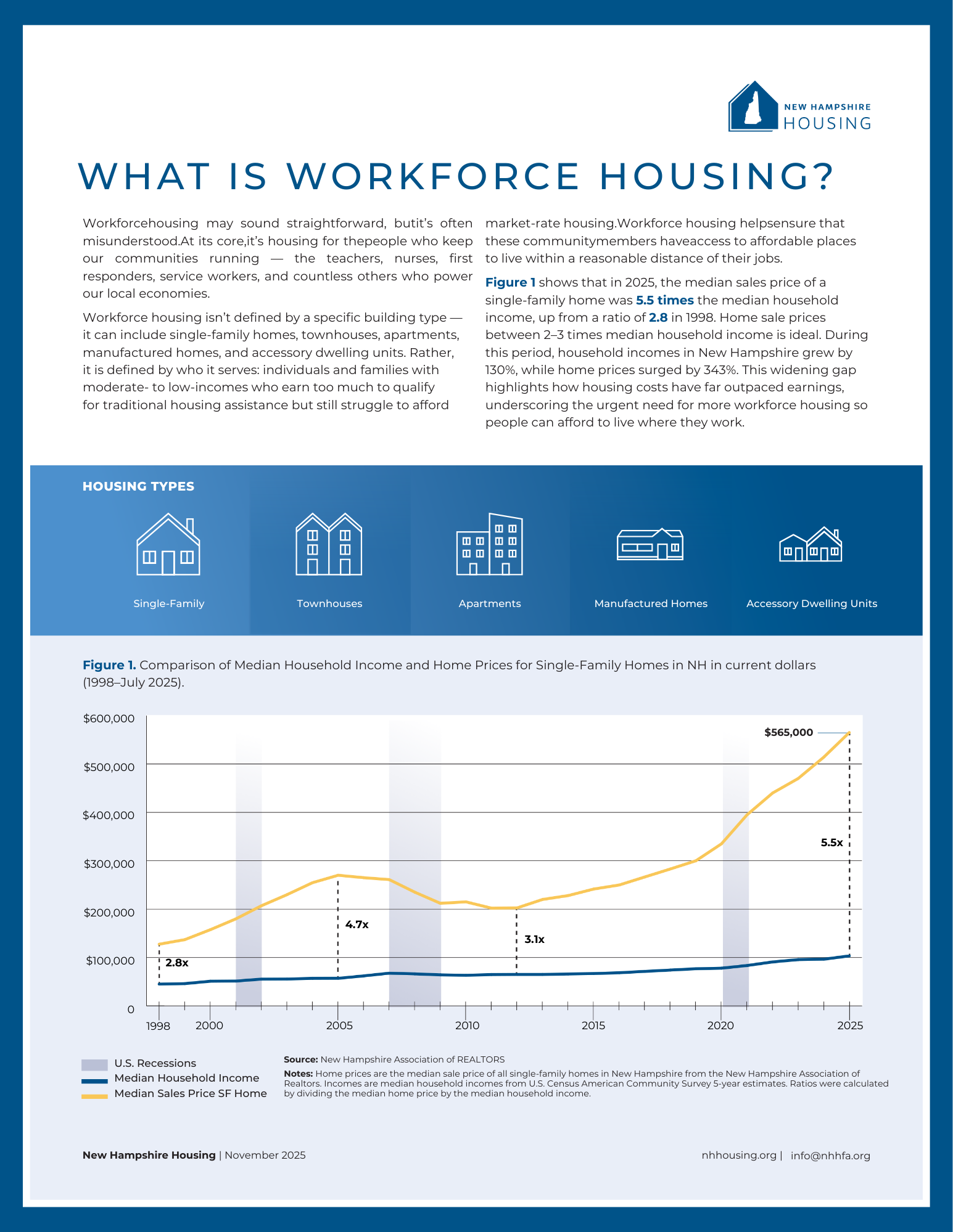 New Hampshire’s economic well-being depends on a sufficient supply of housing to support our diverse workforce. By ensuring there is a balanced and affordable supply of housing in our state, New Hampshire businesses – present and future – will view our state as an attractive place to live and work. In our communities, the interplay of demand, demographics, land use regulations, development, geography, and other factors can make it difficult to find affordable housing solutions for our workforce.